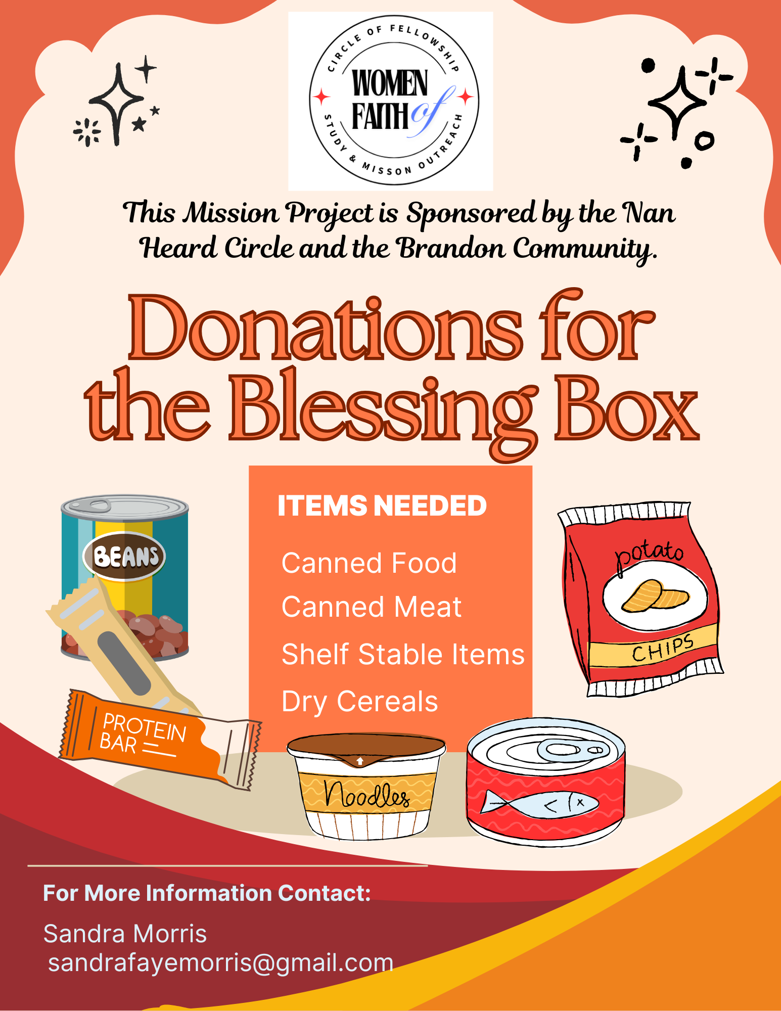 The Food Blessing Box is located at the Brandon Library. The purpose of this ministry is to help people in our community. Anyone can go by an pick up food items they need or drop off items if they wish.